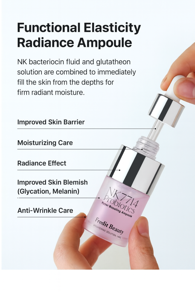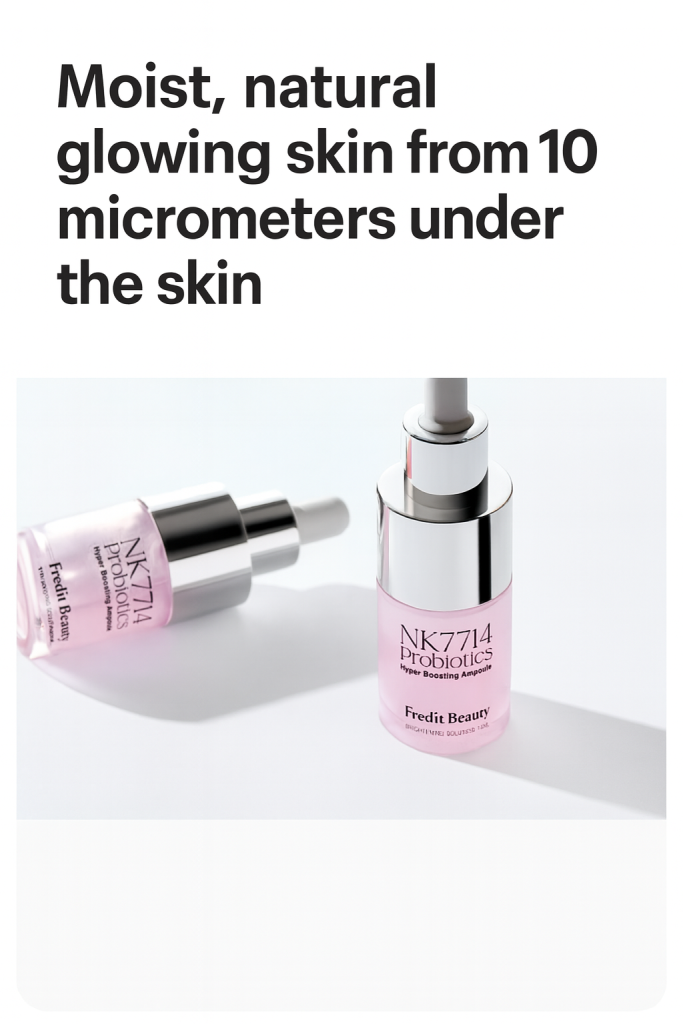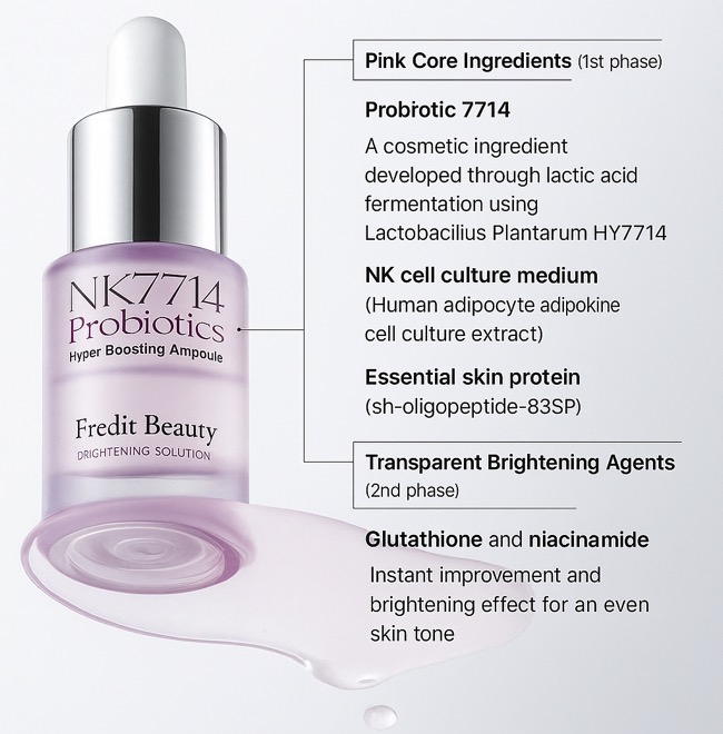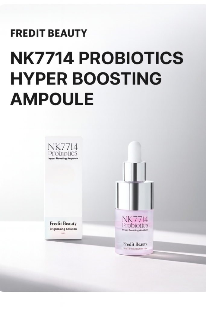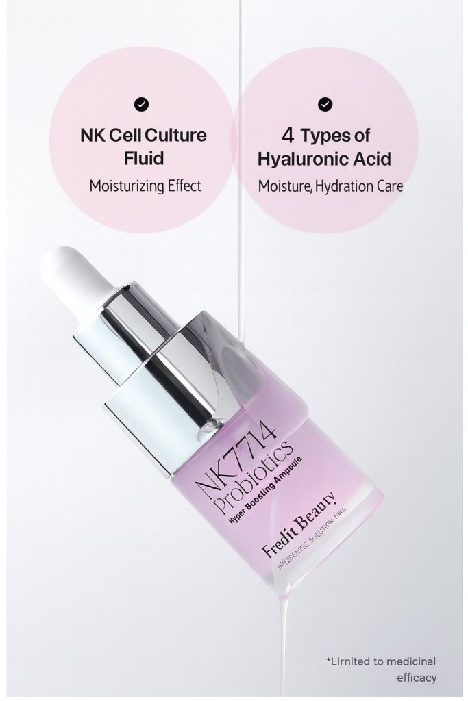 NK7714 Probiotics Hyper Boosting Ampoule by Fredit Beauty delivers deep hydration and radiant skin from within. Formulated with patented Lactobacillus Plantarum HY7714 ferment, NK Cell Culture Extract, and Niacinamide, it strengthens the skin barrier, enhances elasticity, and brightens dull skin. This lightweight ampoule absorbs instantly, leaving your skin plump, luminous, and naturally glowing.